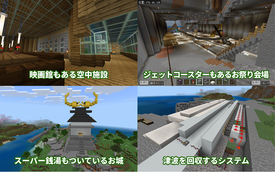 穀物回収装置では、畑の作物をピストンで自動で集める仕組みを構築。作物がちゃんと集まるように回路を工夫しました。ジェットコースターでは、上昇する時の「カタカタ」とゆっくり上がる感じをコンパレータをうまく使って再現しています。